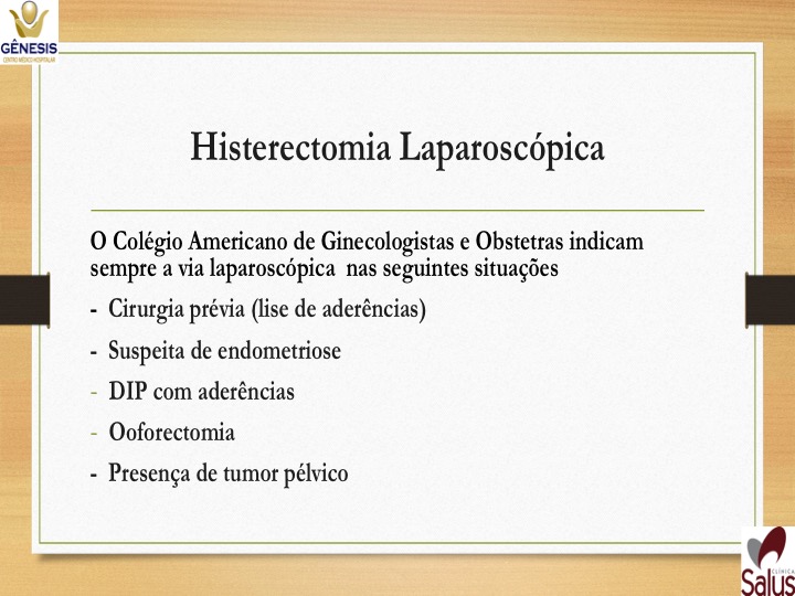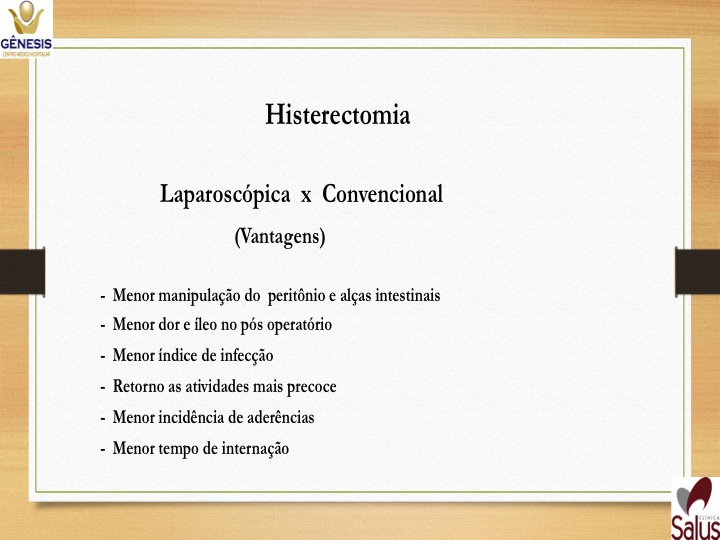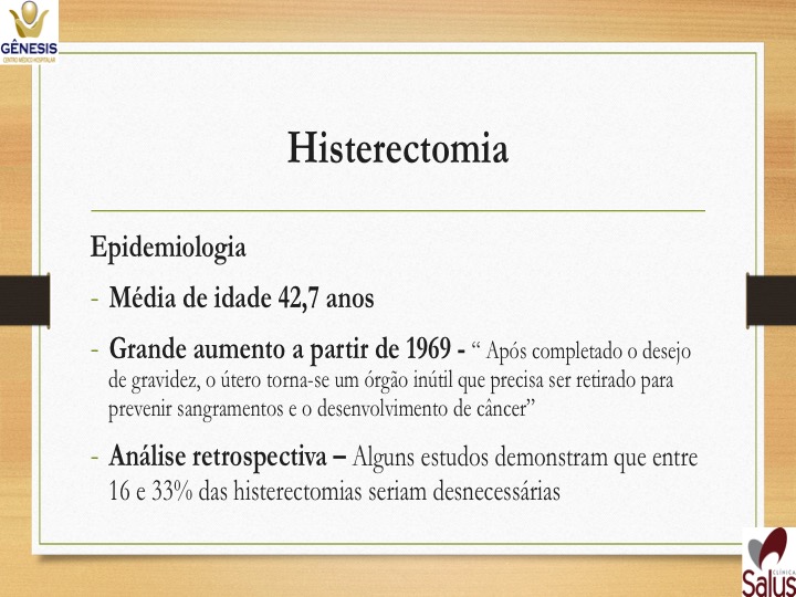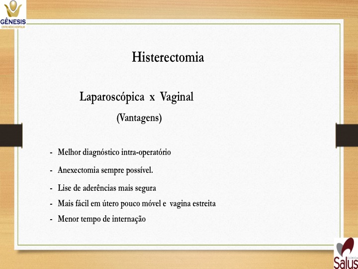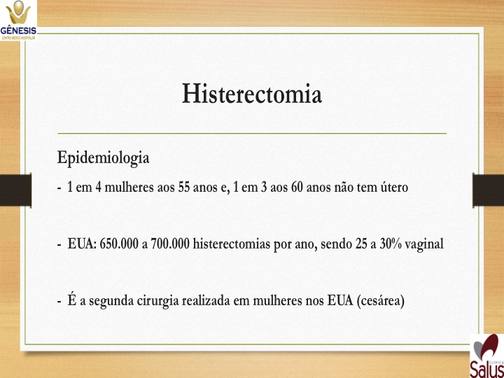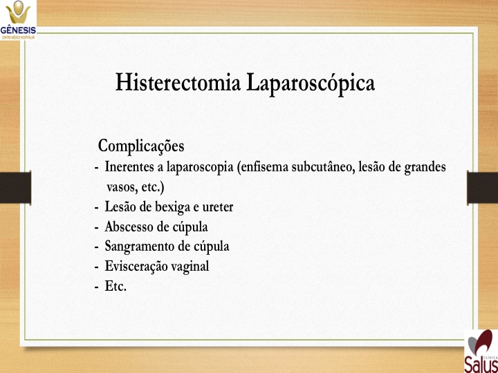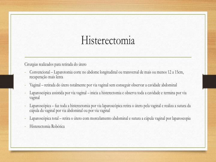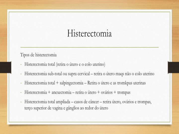 -Histerectomia total ampliada – casos de câncer – retira útero, ovários e trompas, terço superior de vagina e gânglios ao redor do útero.